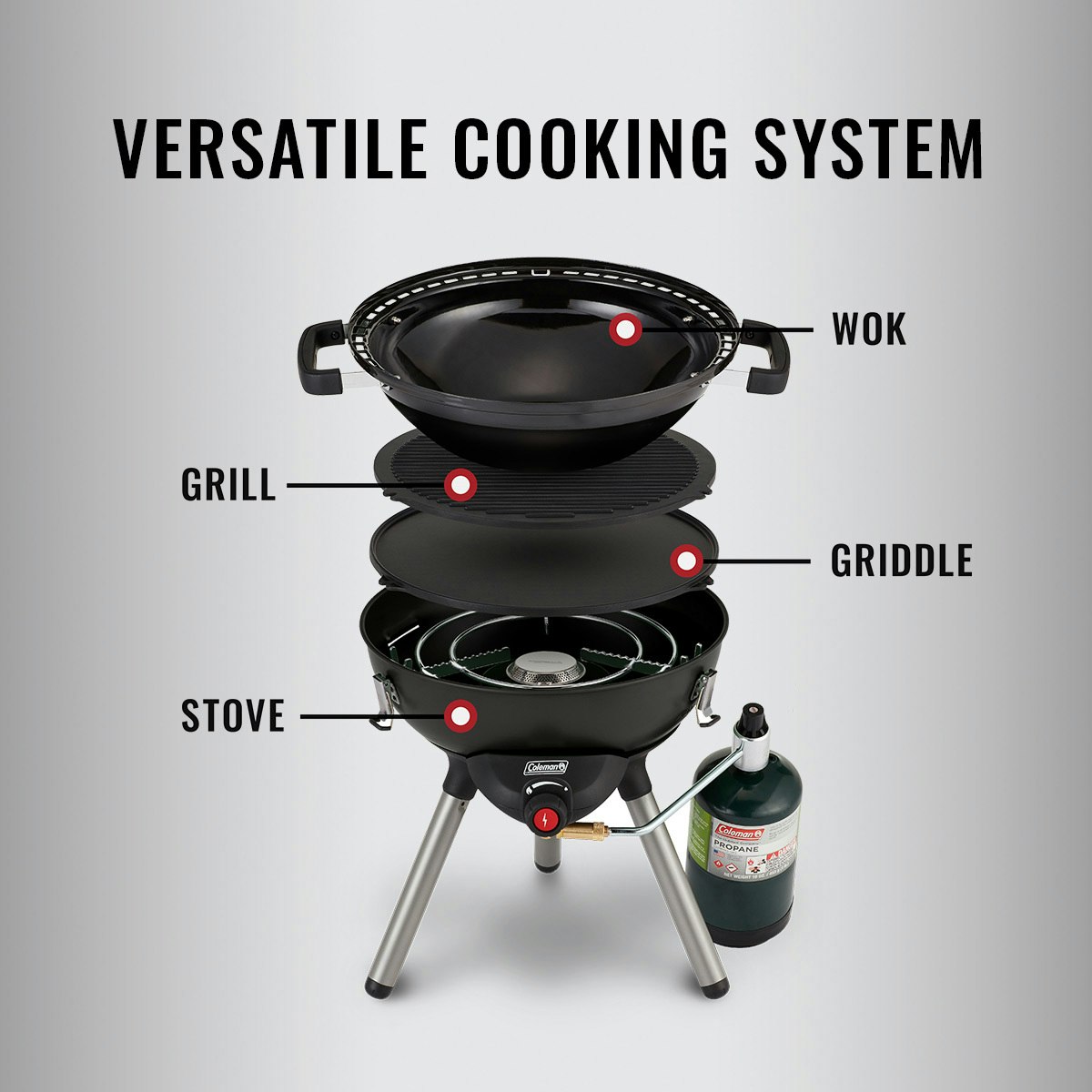 Wow friends and family with a variety of outdoor meals when you travel with the Coleman® 4-in-1 Portable Propane Gas Camping Stove. It features 3 interchangeable cooktop inserts (stove, wok, and reversible griddle/grill) so you can effortlessly prepare breakfast, lunch, or dinner on one very portable, space-saving outdoor cooking solution. The removable legs and inserts conveniently fit inside the inverted wok, while locking latches secure contents whether you’re headed to the beach, park, or campsite.