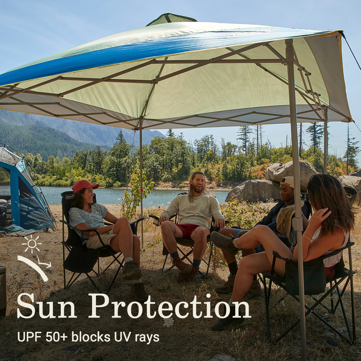 - SUN PROTECTION: UPF 50+ blocks sun’s harmful UV rays; overhanging eaves provide larger shade area (100 sq. ft.); gear pockets at corners hold small items