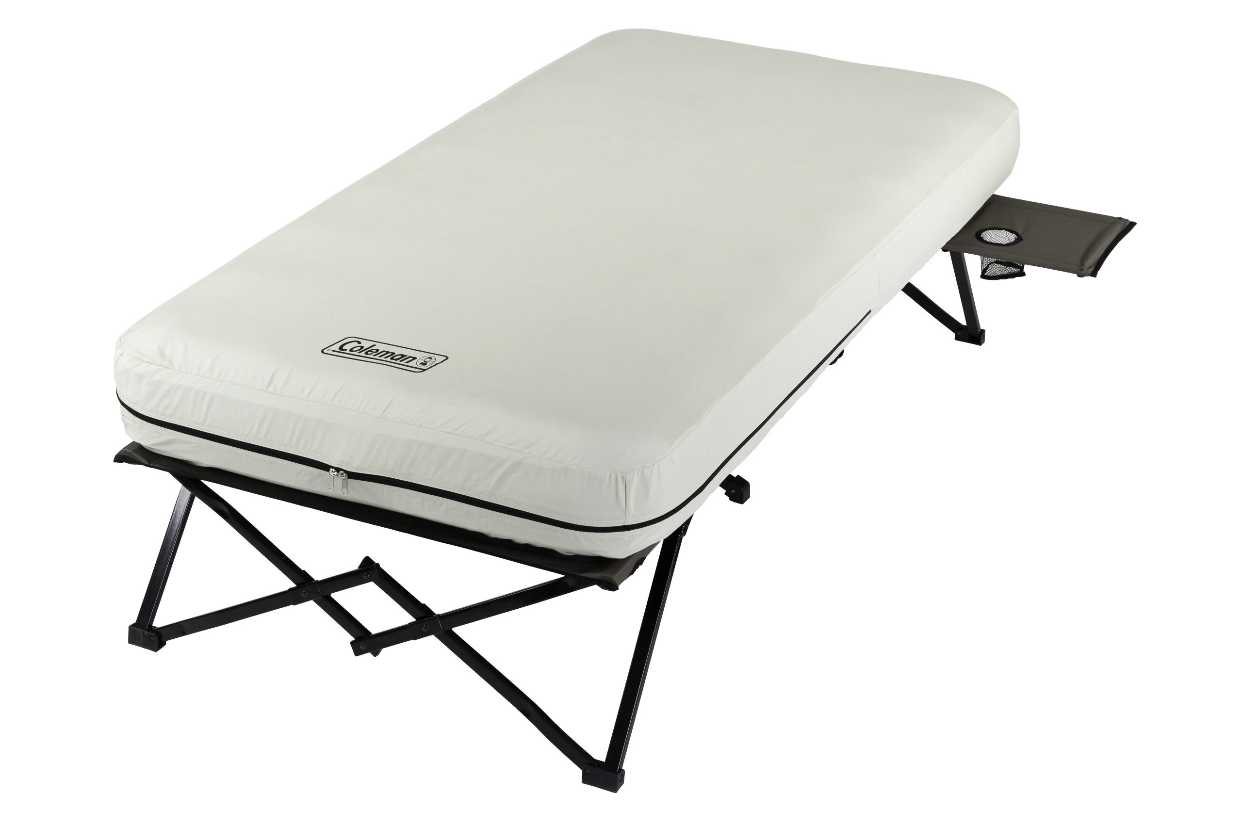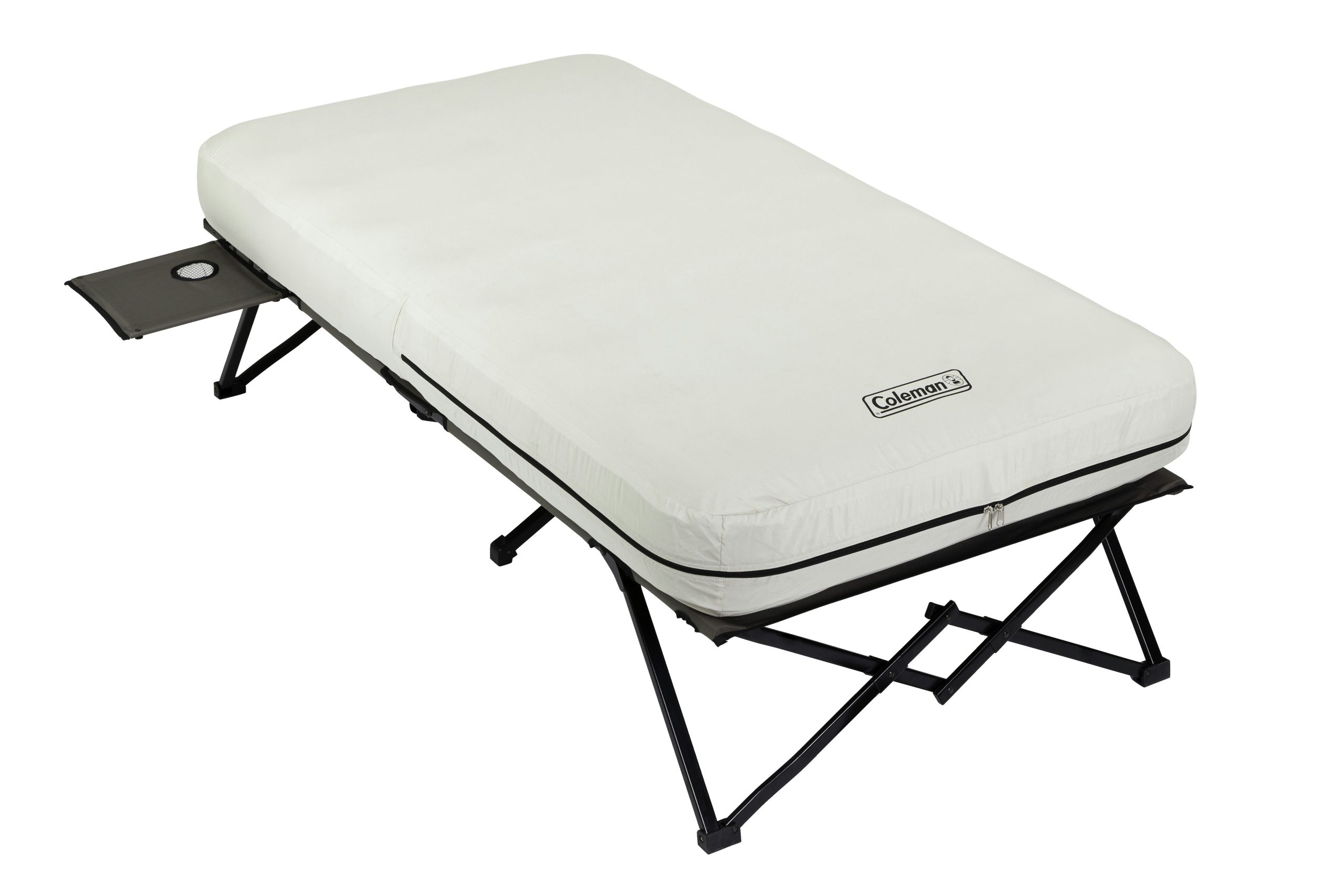 Wherever adventure leads, enjoy the elevated comfort of the Coleman® Camping Cot with Side Tables, Air Mattress & Battery Pump (4 D-cell batteries sold separately). The air bed stays inflated all night thanks to the leak-proof AirTight® system, and its ComfortStrong™ coil construction offers better support. For easy access during the night, place a flashlight or water bottle on the pull-out side tables complete with cup holders.
