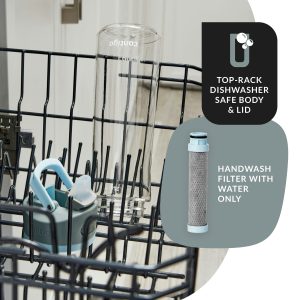 - Lid and body are dishwasher-safe; rinse filter with water only