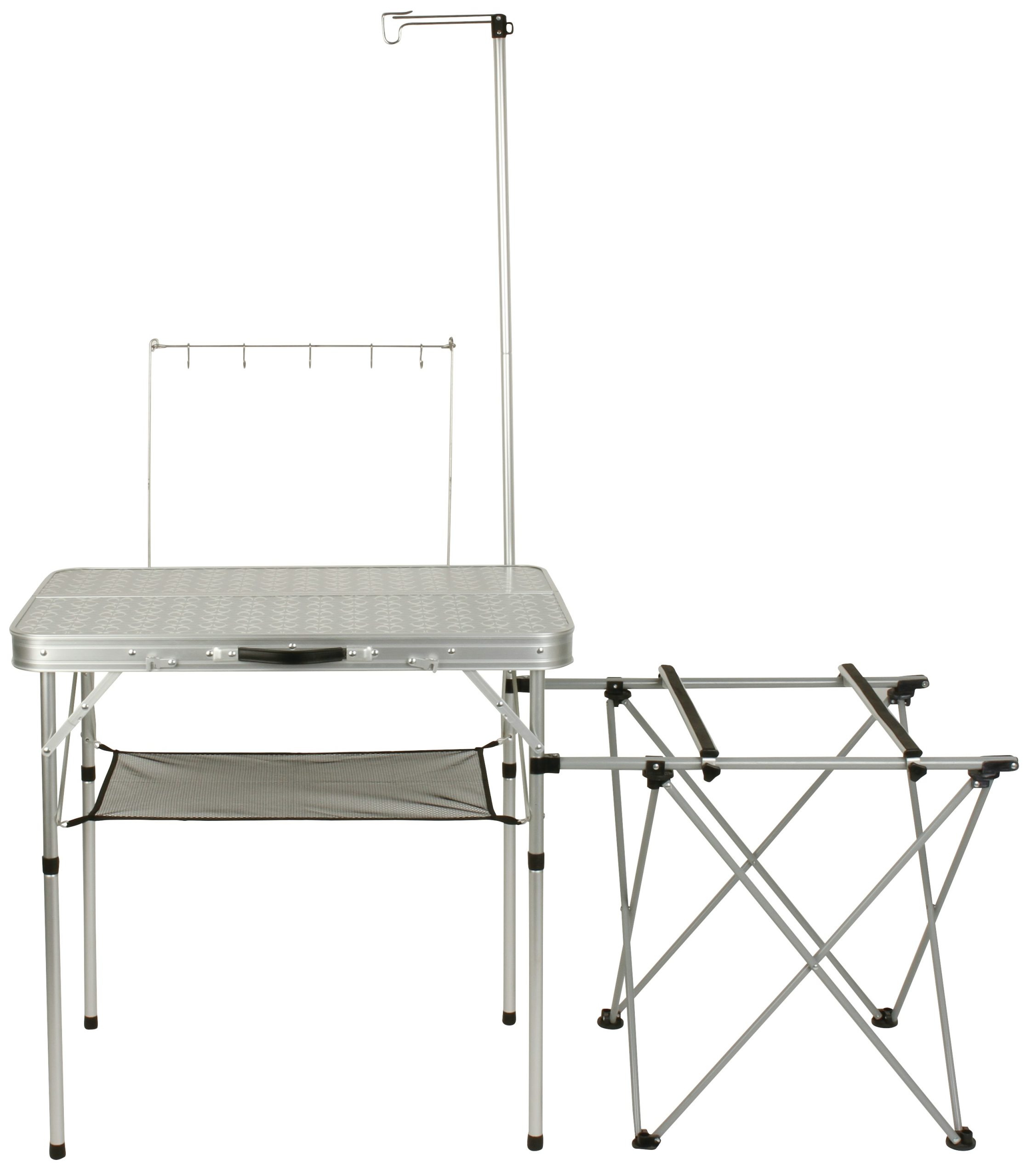Easily set up a portable kitchen at the campsite or an outdoor cookout by extending the aluminum frame of the Coleman® Pack-Away™ Folding Camp Kitchen and snapping on its sturdy fiberboard countertop. Once secure, the outdoor kitchen offers a spacious prep area and a side table accommodates most Coleman stoves and coolers. A lantern holder, hanging hooks, and a mesh shelf keep lights, utensils, plates, and ingredients within easy reach. When it is time to pack up, the frame collapses and the fiberboard prep surface doubles as an integrated storage case for no-hassle transport.