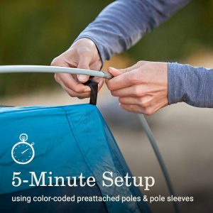 - QUICK SETUP: Sets up in 5 minutes using preattached poles; front left corner on tent and rainfly and brow pole sleeve are color coded red to help aid in fly orientation and setup
