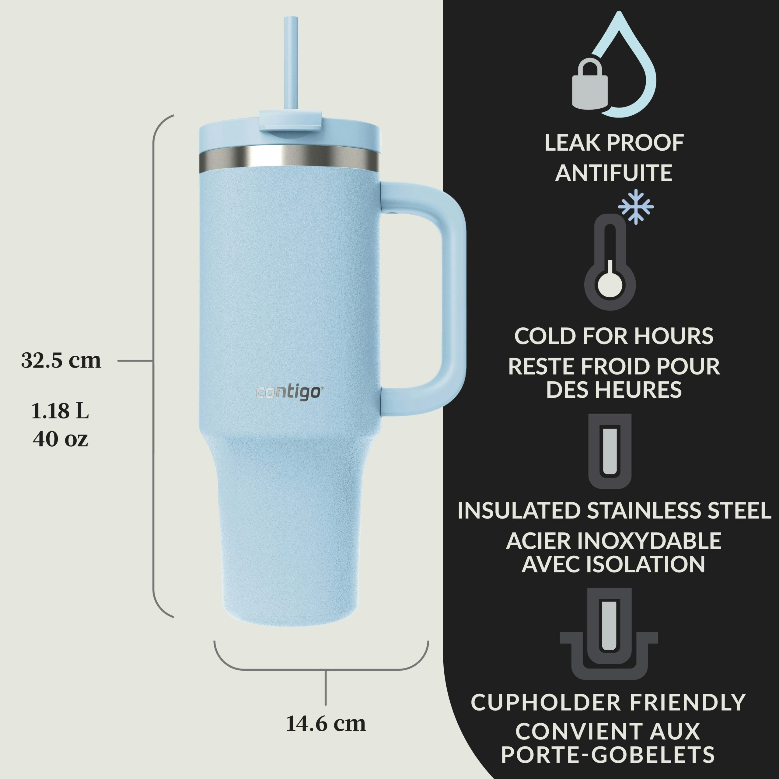 Timeless style meets advanced functionality with the Contigo Streeterville Tumbler, 40 oz (1.18 L). This timeless classic gets a trend-forward makeover and updates such as a multi-use lid that allows you to sip with a straw or directly from the mouth. With the straw removed and a closed lid, the Streeterville 40 oz is fully leak-proof so you can stay hydrated without the mess while on the move. With double-wall stainless steel vacuum insulation, it keeps drinks cold for up to 29 hours, helping you keep cool when the heat just won’t quit. It’s also built for your on-the-go lifestyle thanks to an easy-carry handle and compatibility with most cupholders. Made with all BPA-free parts, the lid is top-rack dishwasher safe while the body is fully accessible for washing by hand.